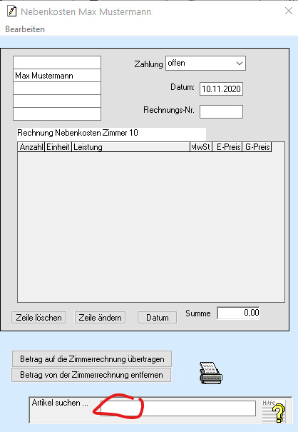Ist die Zusammenstellung fertig, kann diese als Getränkeaufstellung gedruckt werden („Betrag auf die Zimmerrechnung“), oder man wählt vor dem Drucken, diese als Rechnung mit einer neuen Rechnungsnummer auszudrucken.